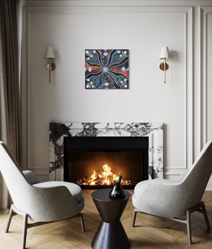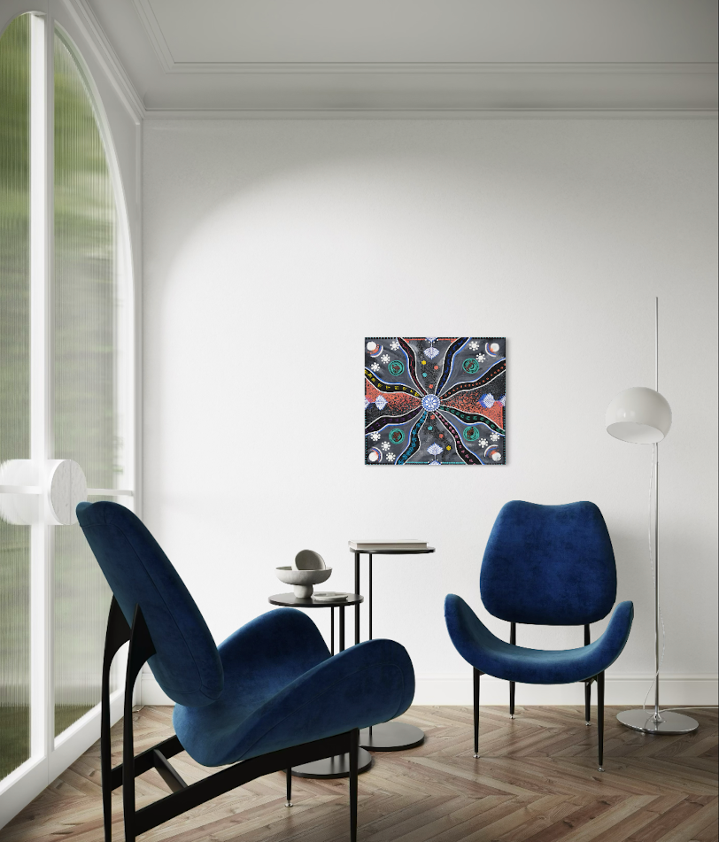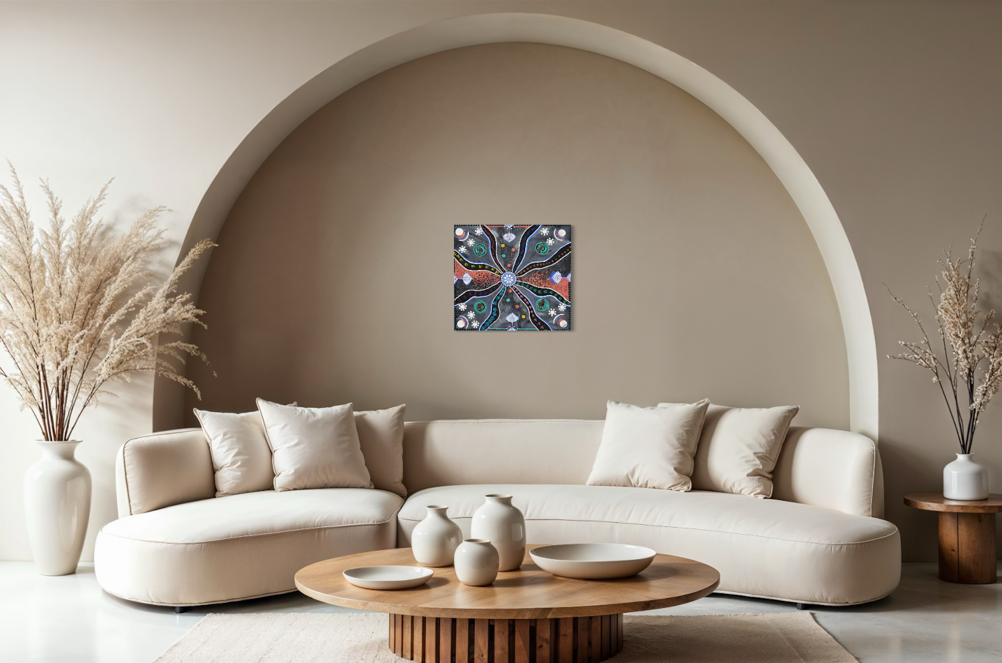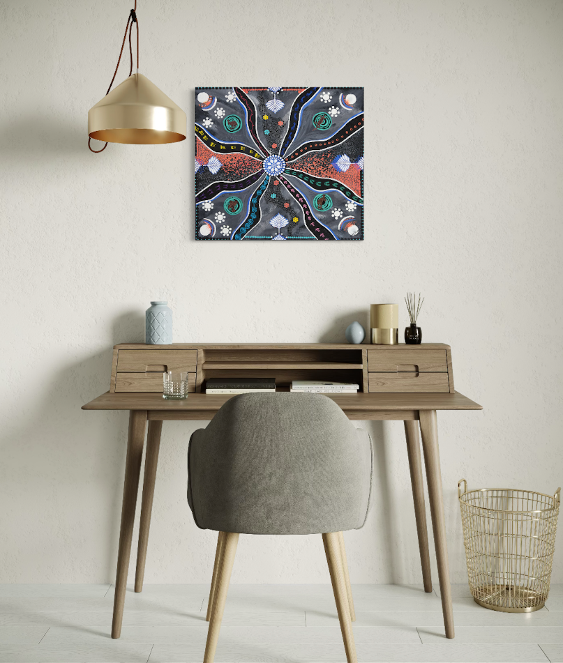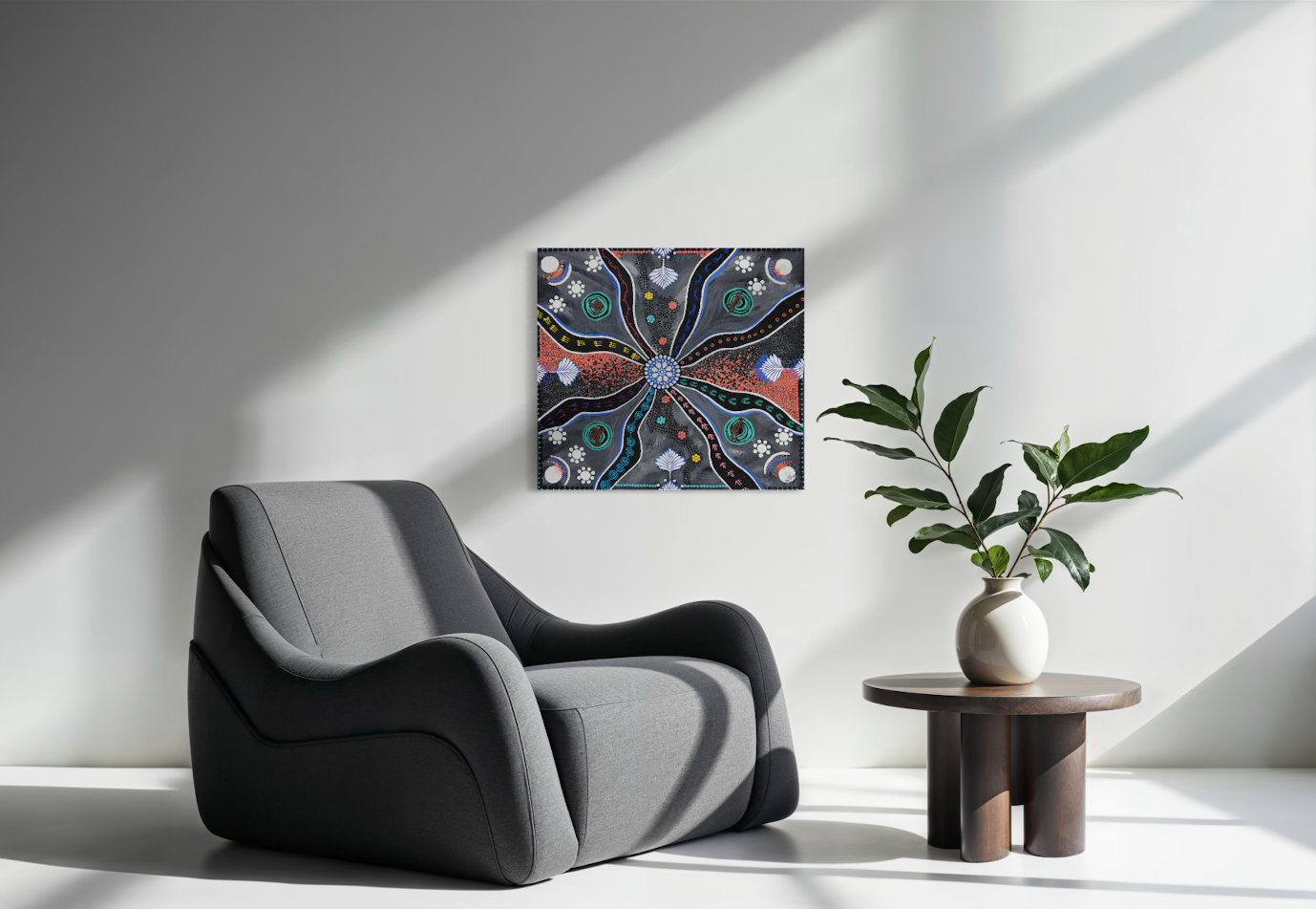 STORY BEHIND THE WORK: I often think to myself that I am the luckiest person in the world to have a culture so beautiful and rich. Our connection to all things is so spiritual. In the whispers from the trees and vibrations from the ground I can feel my Ancestors calling me home.