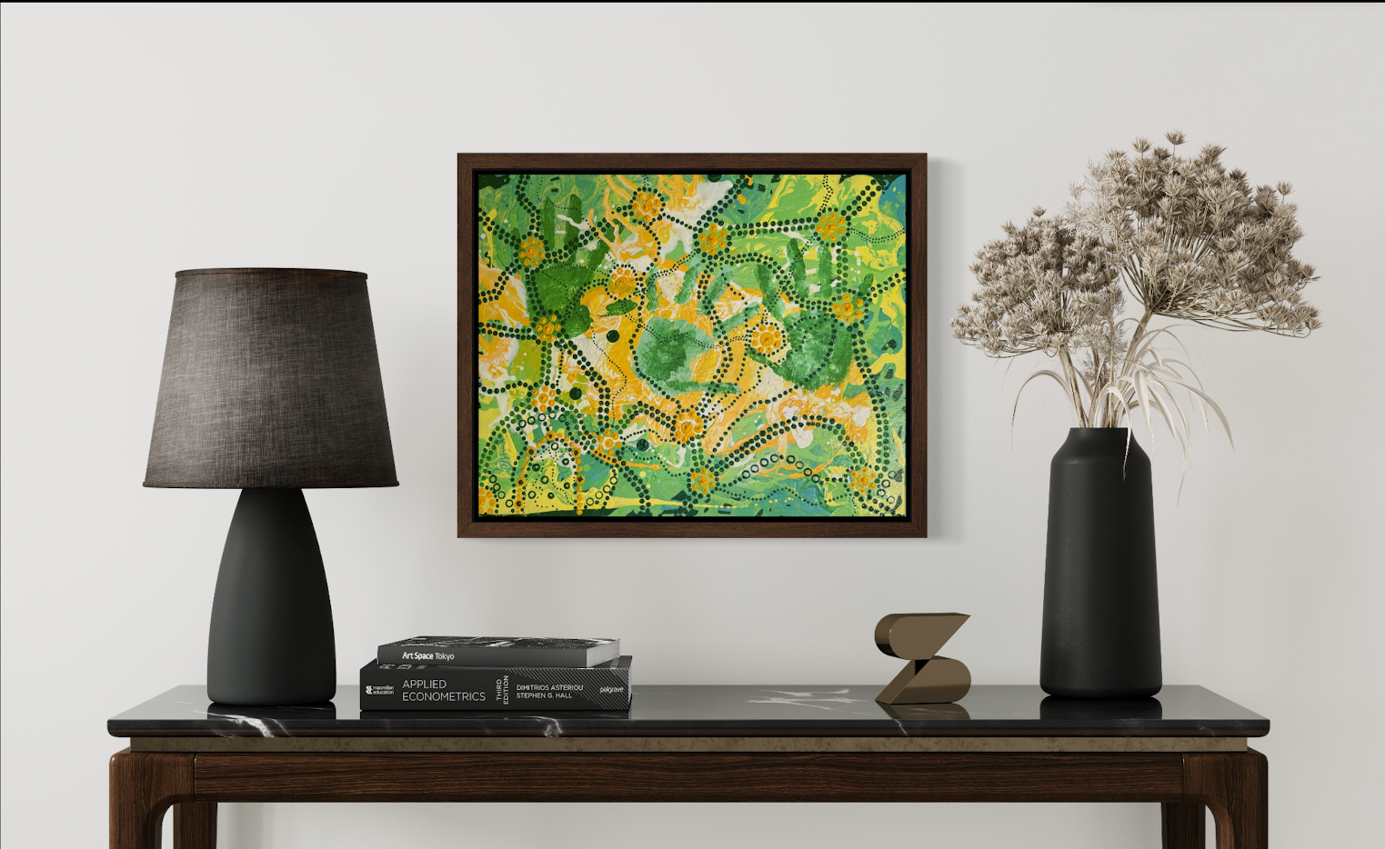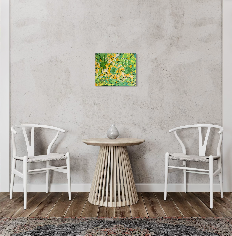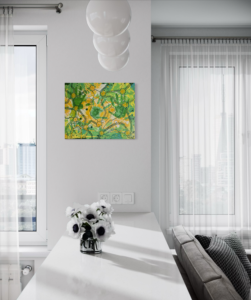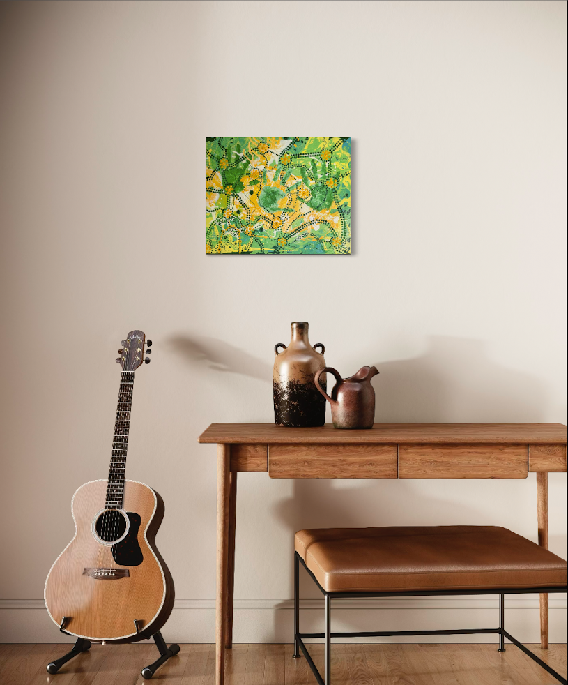 THE STORY BEHIND THE PAINTING: This painting, a vibrant mix of green and yellow on a 40 cm x 50 cm canvas, crafted in 2025 with acrylics, is my heart’s echo a proud Wiradjuri woman from New South Wales, now living on Wurundjeri Country in Naarm (Melbourne). The greens are my childhood rivers, where my grandmother’s songs linger. The yellow blooms are her laughter, guiding me. The dotted lines trace my journey from home to here, each dot a heartbeat amid the ache of distance.