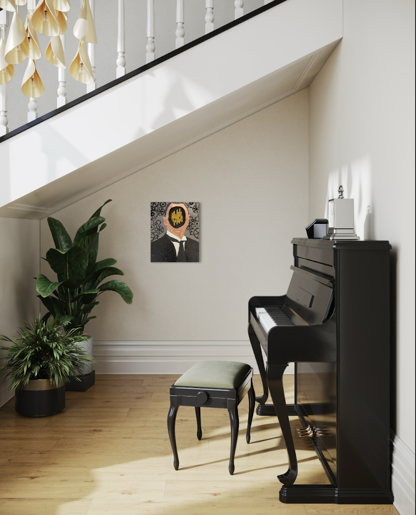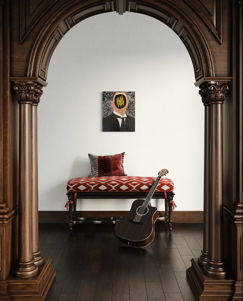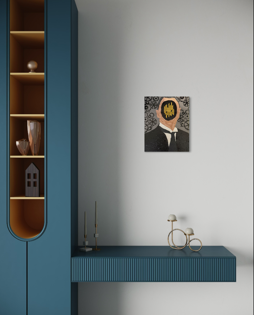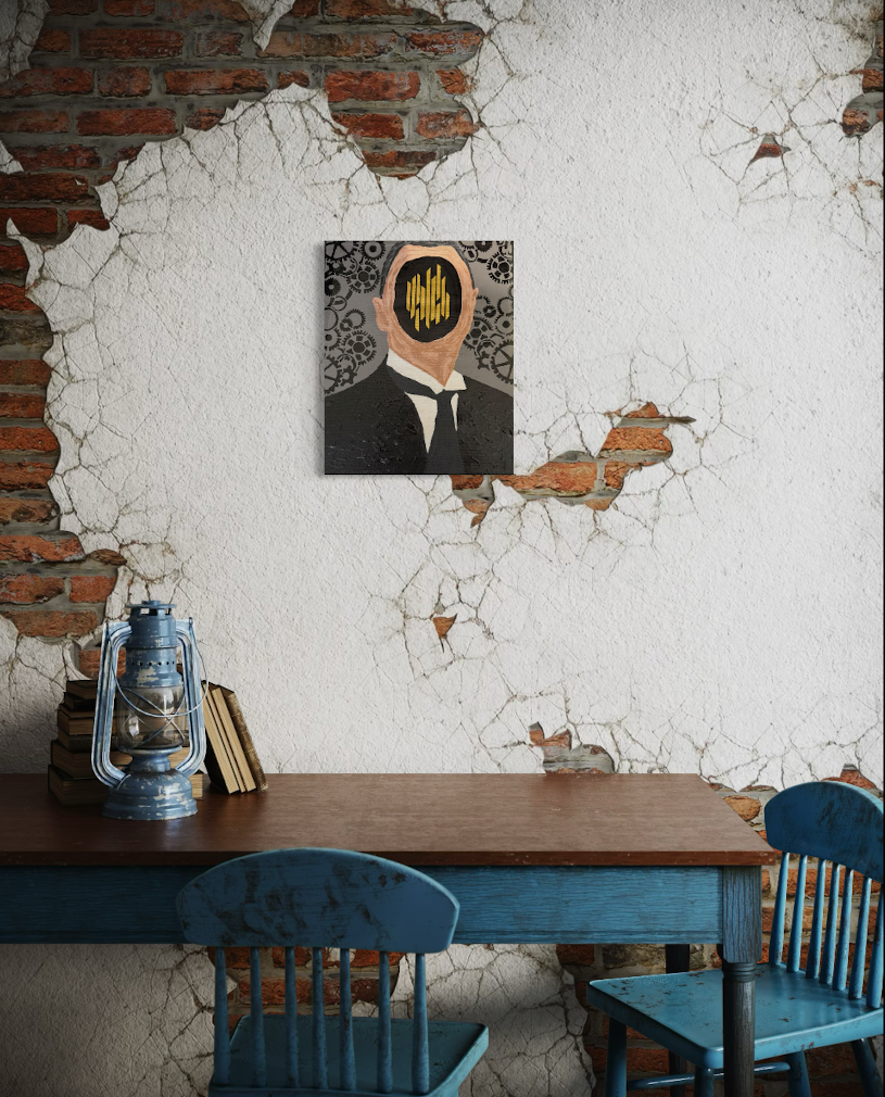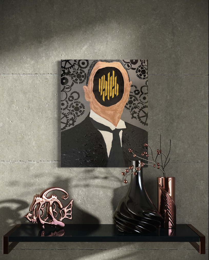 The faceless man represents a country of men that have only have money on their mind. They have tried to sacrifice a race of people to help pay for their fancy suits and their way of life. Keep us as their slaves. The cogs in the background represent the way in which they keep operating behind the scenes, to stay in control of our land, children, culture and language. We will not let 65000 years of our people's culture be wiped out. We stand strong. This is and always will be Aboriginal land.