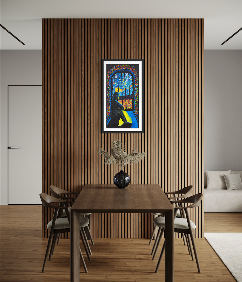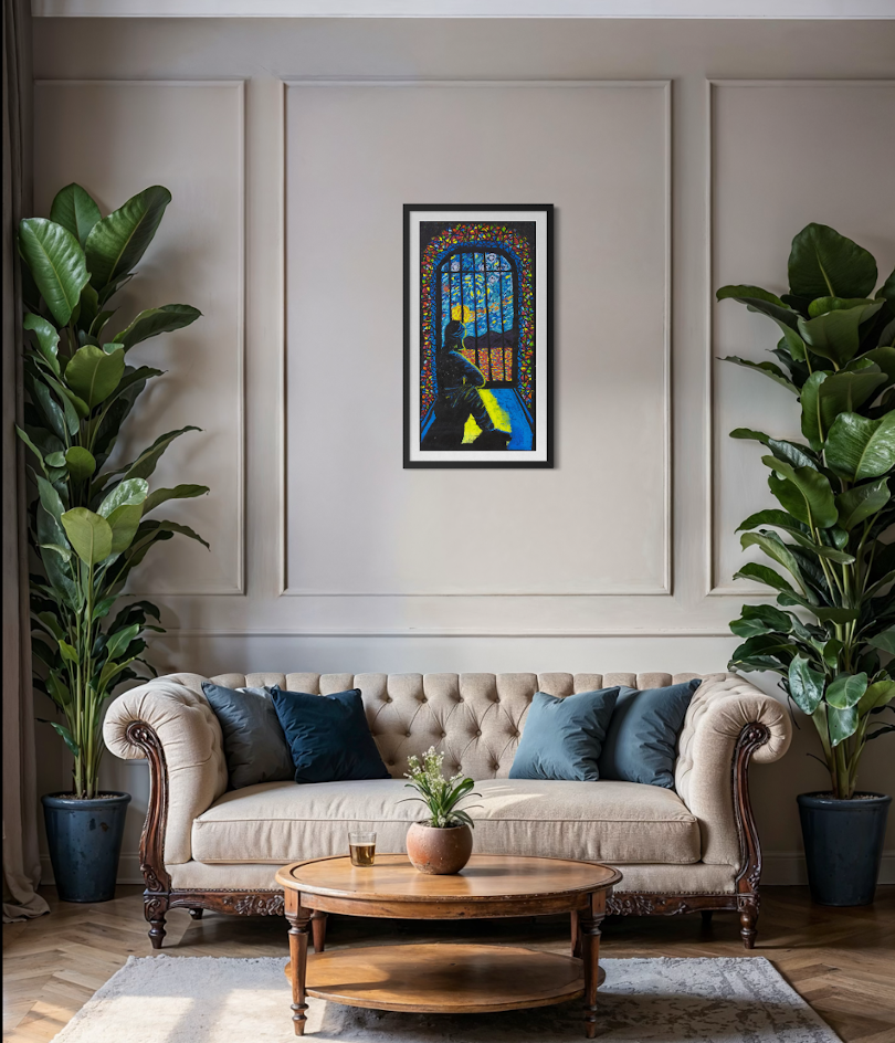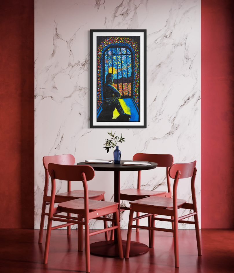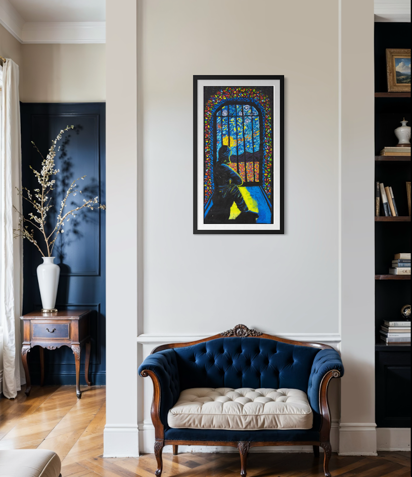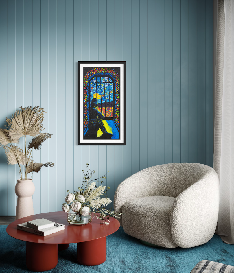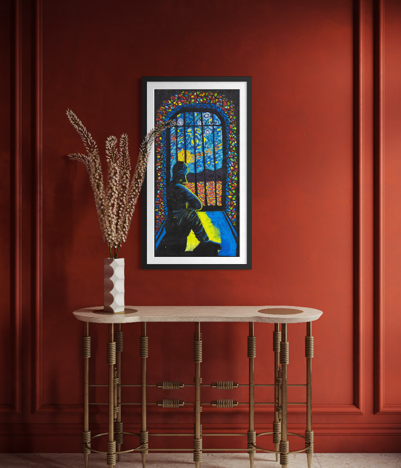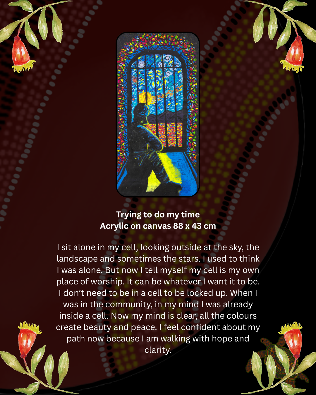 THE STORY BEHIND THE ARTWORK: I sit alone in my cell, looking outside at the sky, the landscape and sometimes the stars. I used to think I was alone. But now I tell myself my cell is my own place of worship. It can be whatever I want it to be. I don’t need to be in a cell to be locked up. When I was in the community, in my mind I was already inside a cell. Now my mind is clear, all the colours create beauty and peace. I feel confident about my path now because I am walking with hope and clarity.