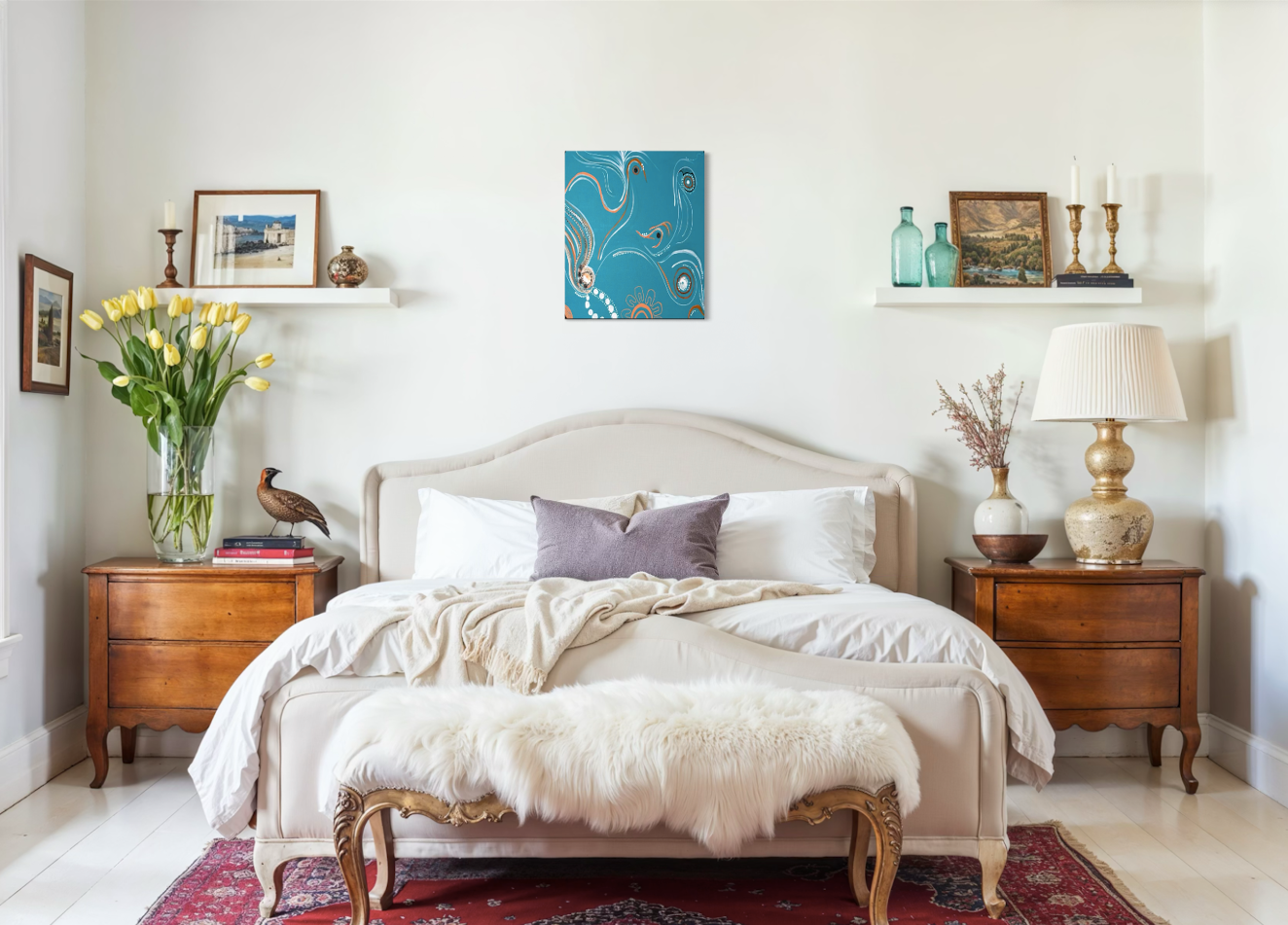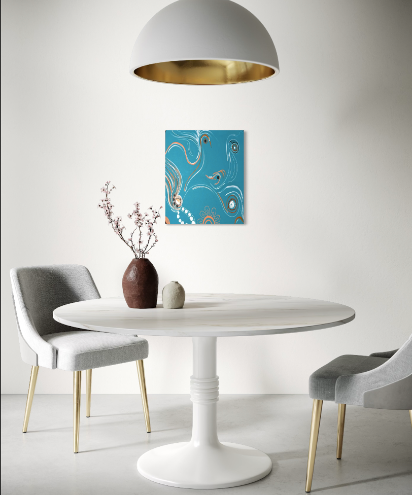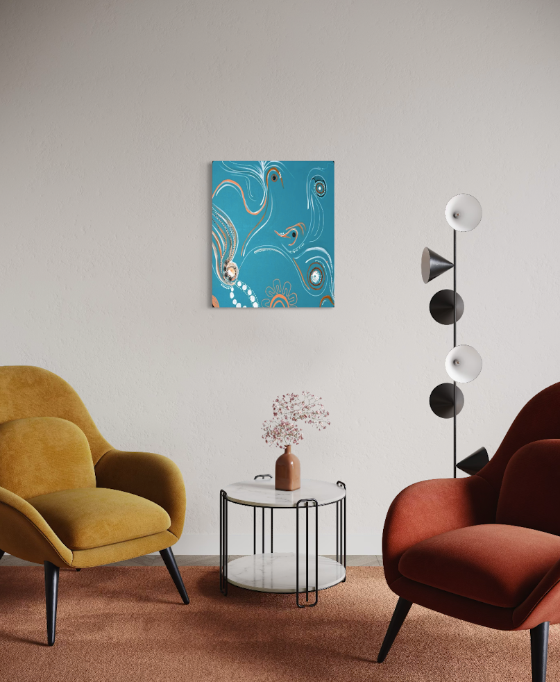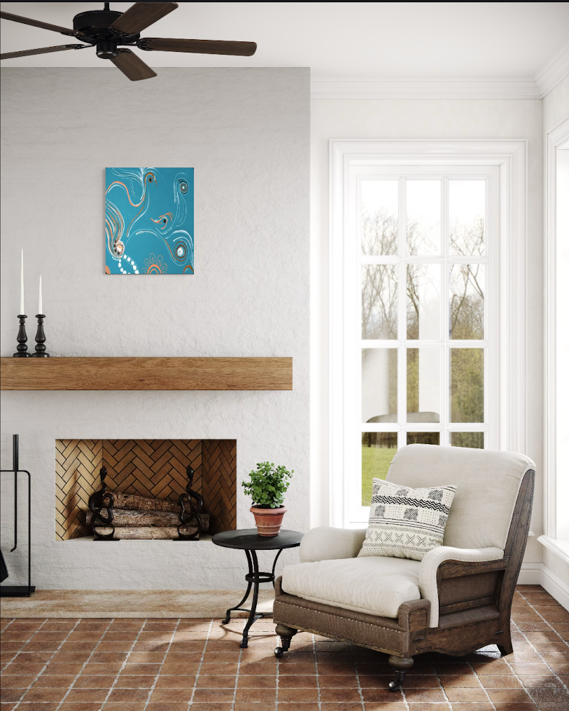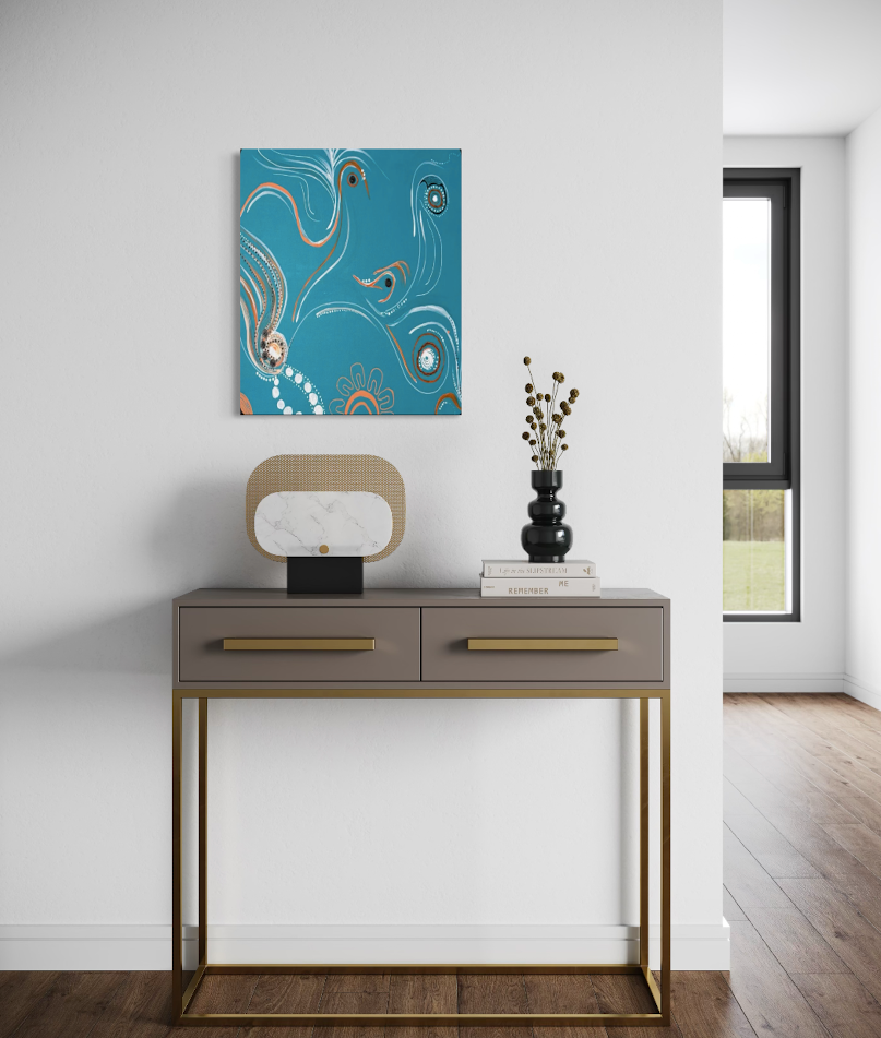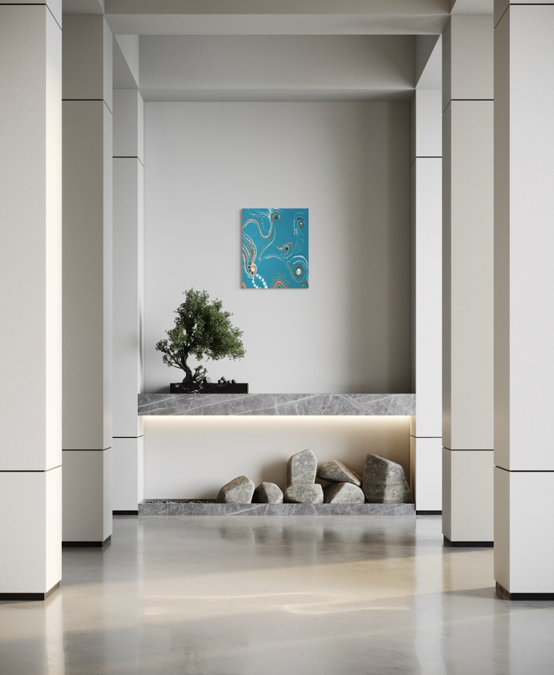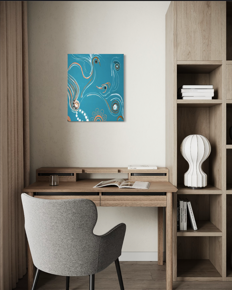 This painting is a horizon opening — the kind of place where sky and earth lean into each other, carrying whispers of ancestors in the wind. It tells of journeys walked under burning sun, laughter carried across open ground, and the way light can guide us back when we feel lost.