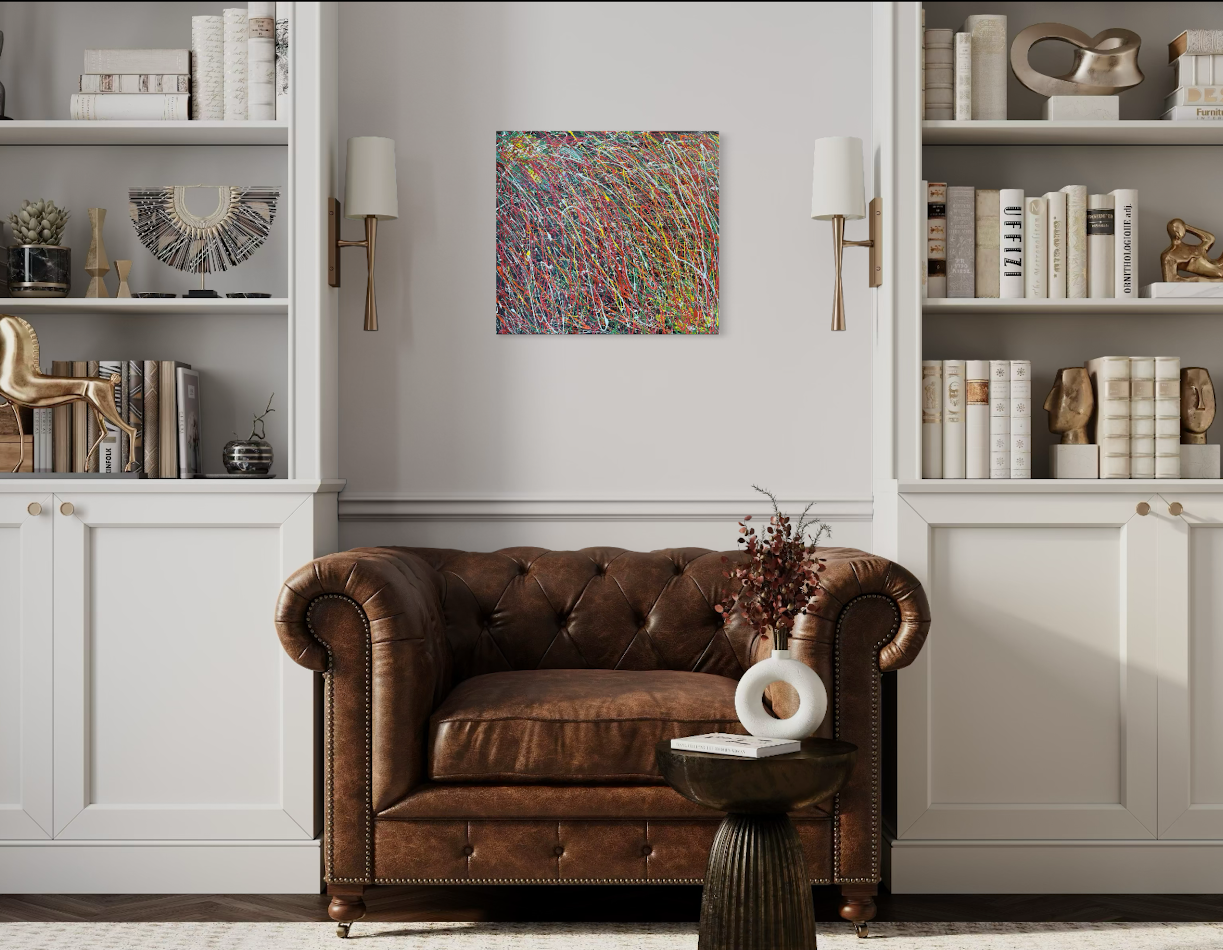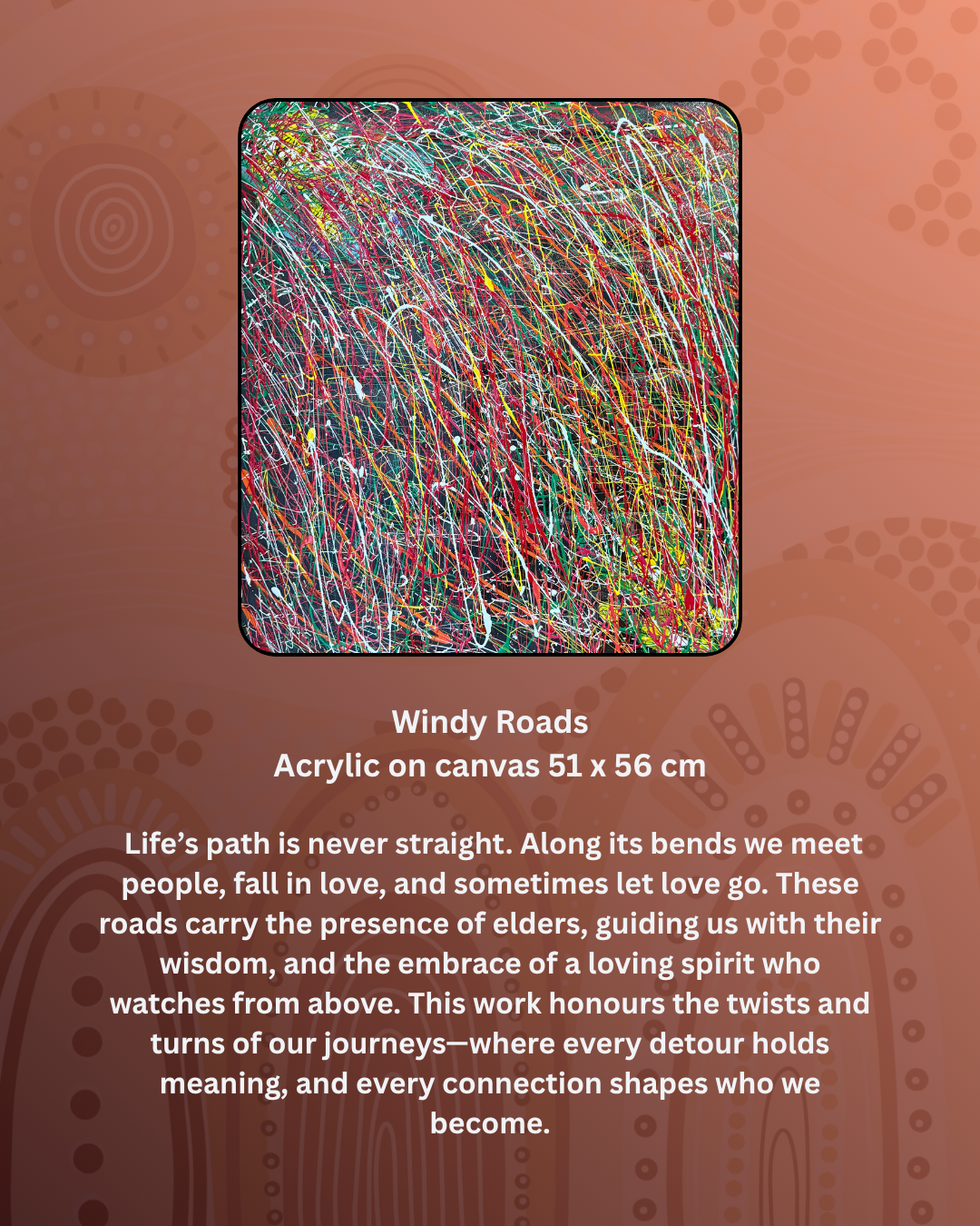 THE STORY BEHIND THE PAINTING: Life’s path is never straight. Along its bends we meet people, fall in love, and sometimes let love go. These roads carry the presence of elders, guiding us with their wisdom, and the embrace of a loving spirit who watches from above. This work honors the twists and turns of our journeys—where every detour holds meaning, and every connection shapes who we become.