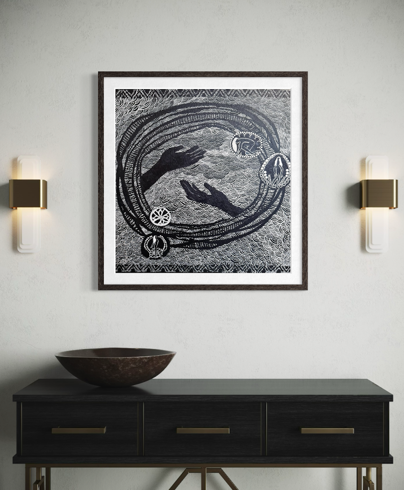 THE STORY BEHIND THE ARTWORK: This work celebrates the quiet power of women reaching out to one another. Each gesture becomes a thread of resilience, weaving connection, care, and strength. It reminds us that healing is rarely solitary—our hands, when extended, become bridges of survival and solidarity.